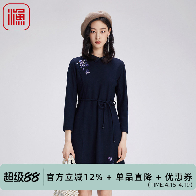 渔牌女装秋季2024新款翻领纯羊毛中式刺绣花毛呢连衣裙子FGGC0029