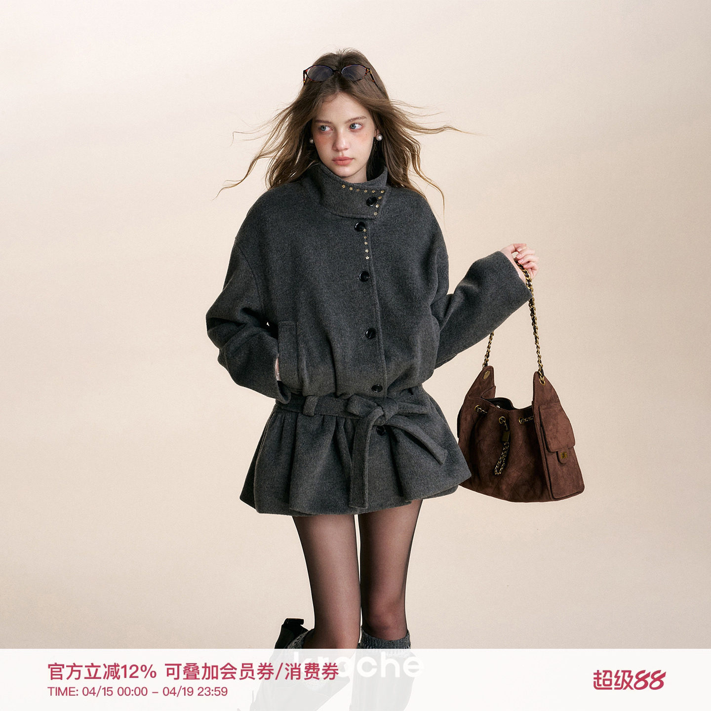 白鹿语翻领修身连衣裙毛呢大衣25秋冬新款千金风显瘦百搭毛呢外套