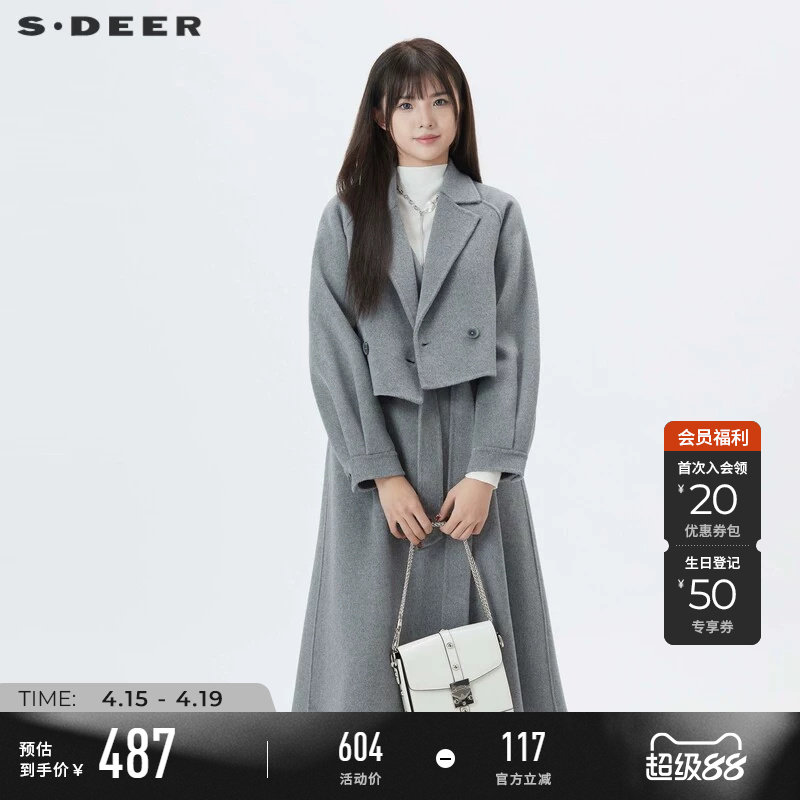 sdeer圣迪奥冬季女装西装领收腰毛呢外套连衣裙套装S23481402
