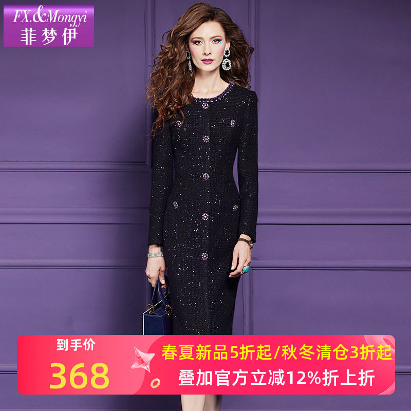 菲梦伊小香风连衣裙女秋季高级感名媛复古加厚修身亮片毛呢一步裙
