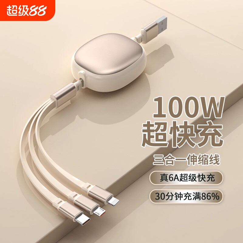 100W超快充数据线便携一拖三可伸缩超三合一6a充电线适用typec苹果华为vivo车载USB安卓手机多功能三头平板线