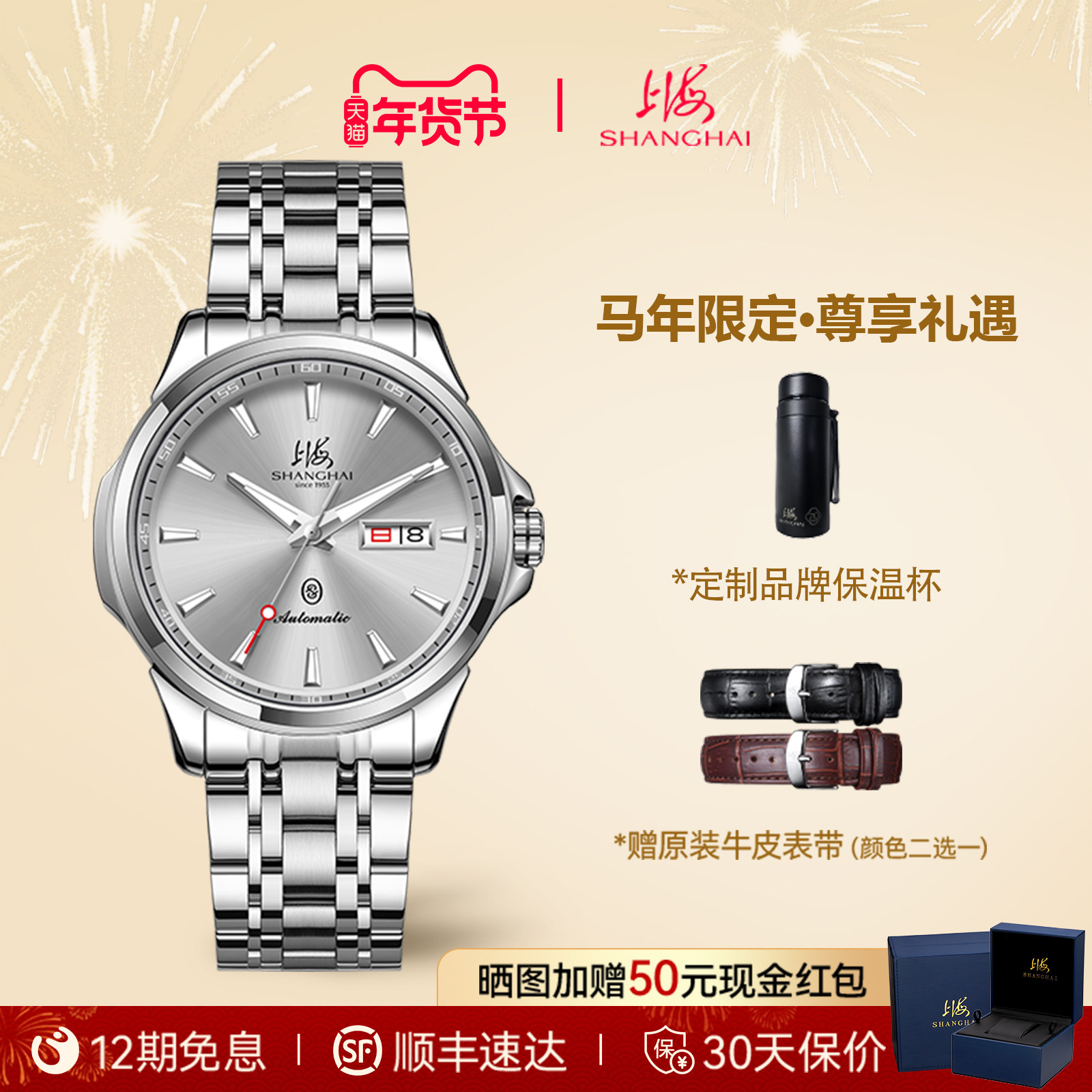 上海牌2025新款男士全自动机械腕表夜光日历防水精钢表带商务送礼
