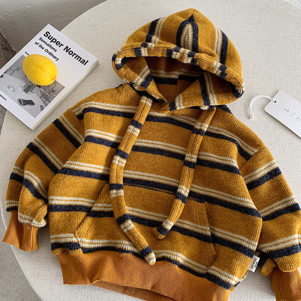 儿童套头针织衫男春季新款小童装条纹毛衣韩版宝宝连帽卫衣女洋气