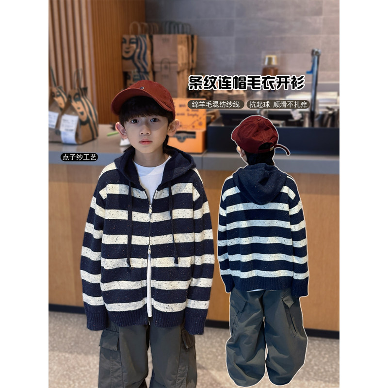凯文家童装2025年冬季新品男童中大童韩版条纹连帽针织开衫外套