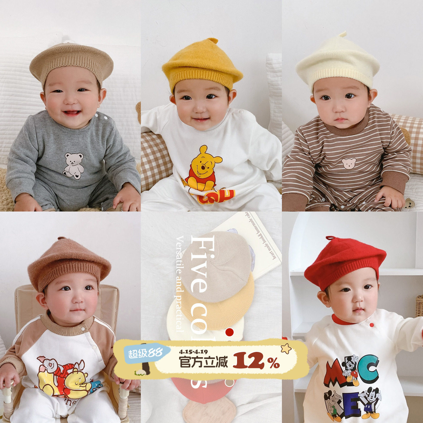 儿童贝雷帽秋冬季韩版小熊婴幼儿男童针织毛线画家帽潮公主帽洋气