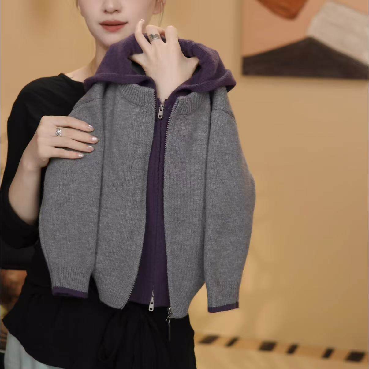 加厚版!紫色连帽拉链毛衣开衫女春季新款韩版宽松长袖针织衫上衣