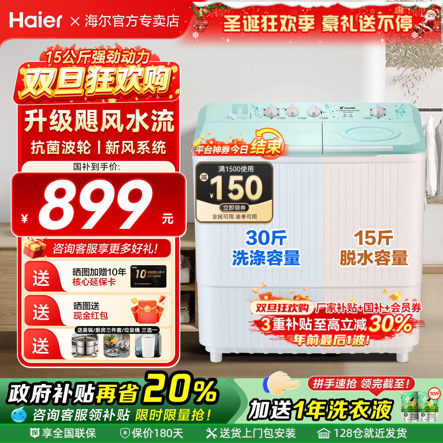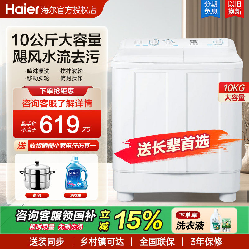 海尔洗衣机家用波轮双缸半自动老式双桶10KG/15公斤大容量旗舰店