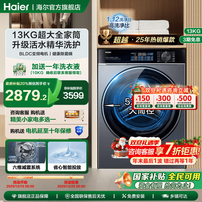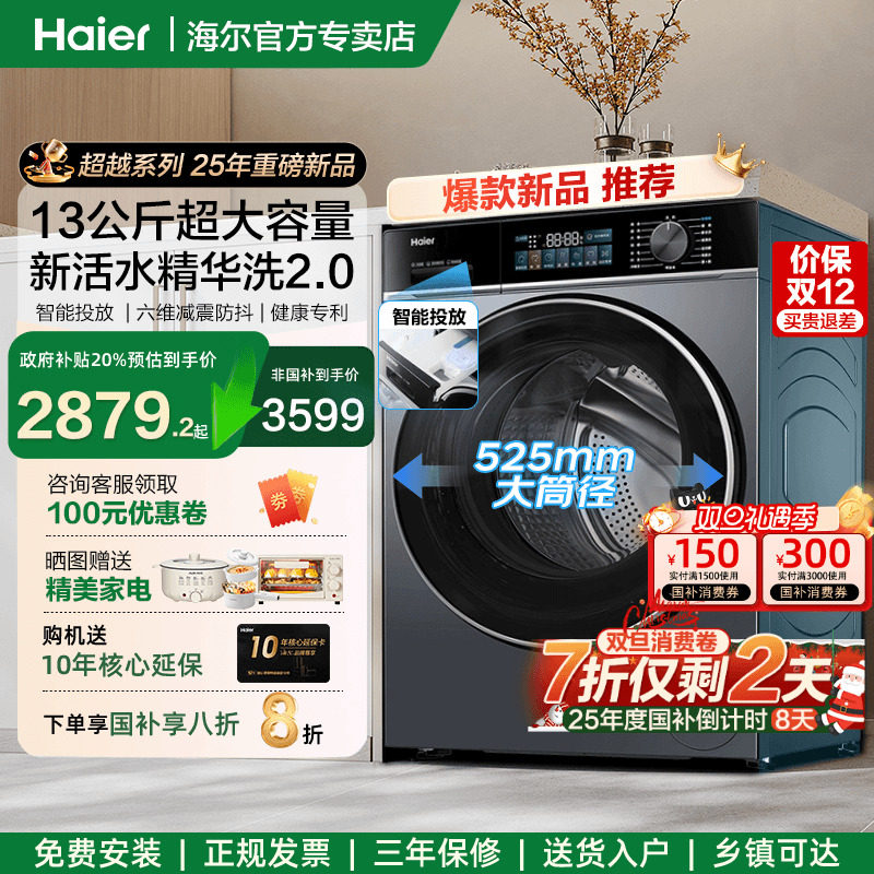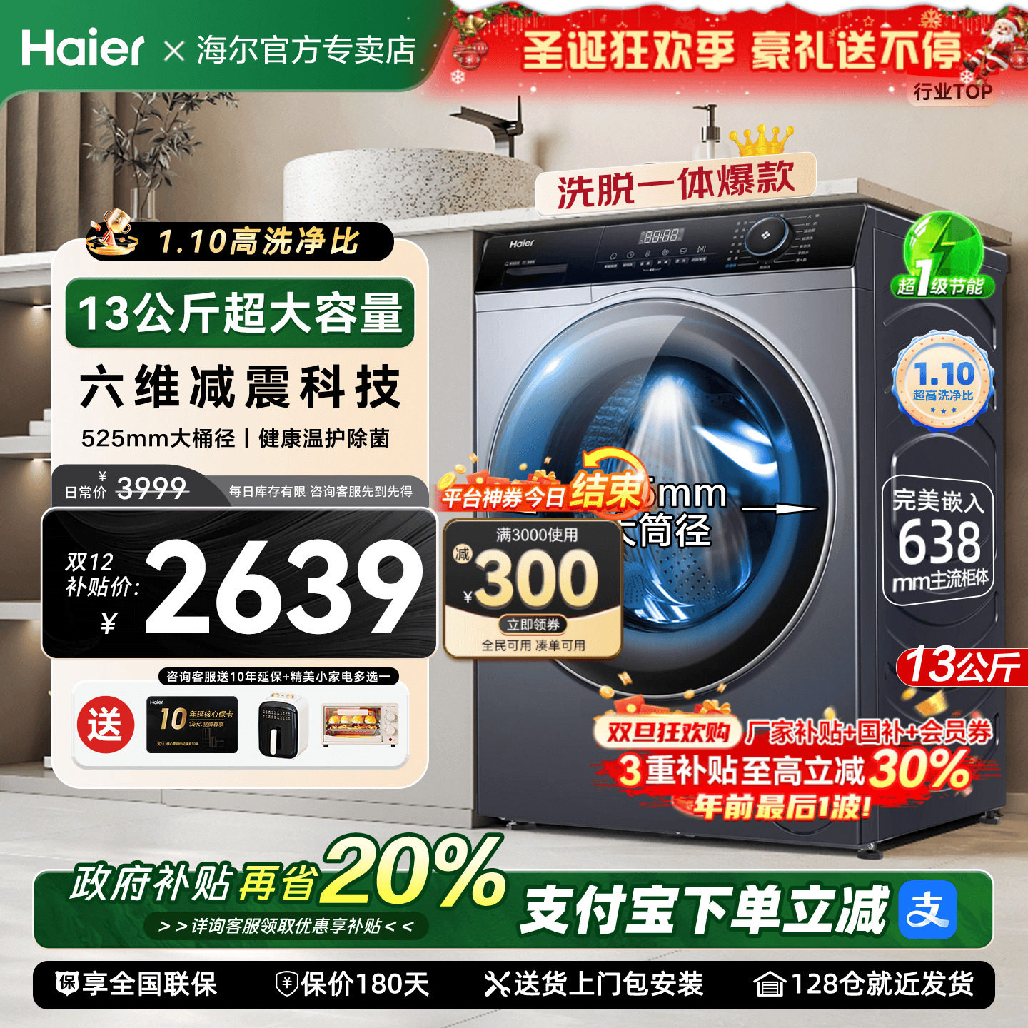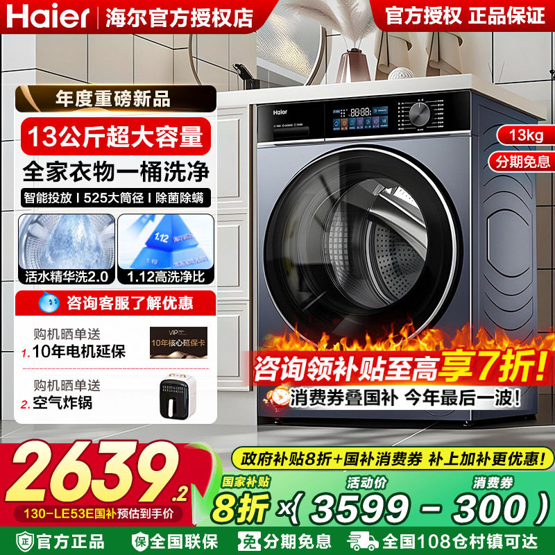 【国家补贴20%】海尔洗衣机家用13公斤大容量全自动滚筒53E旗舰店