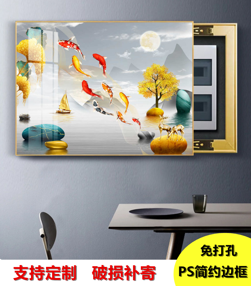 九鱼图饭厅挂画电表箱装饰画可推拉免打孔遮挡挂画配电箱开关盒画