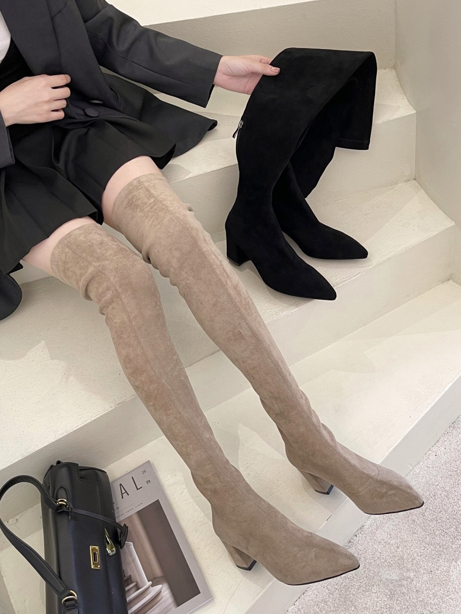 JCEC秋冬超长靴女过膝盖长筒靴高跟显瘦大腿靴粗跟尖头瘦腿弹力靴