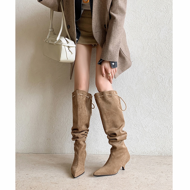 冬季尖头高筒靴粗高跟弹力靴子女2024新款长靴女过膝长筒靴卡其色