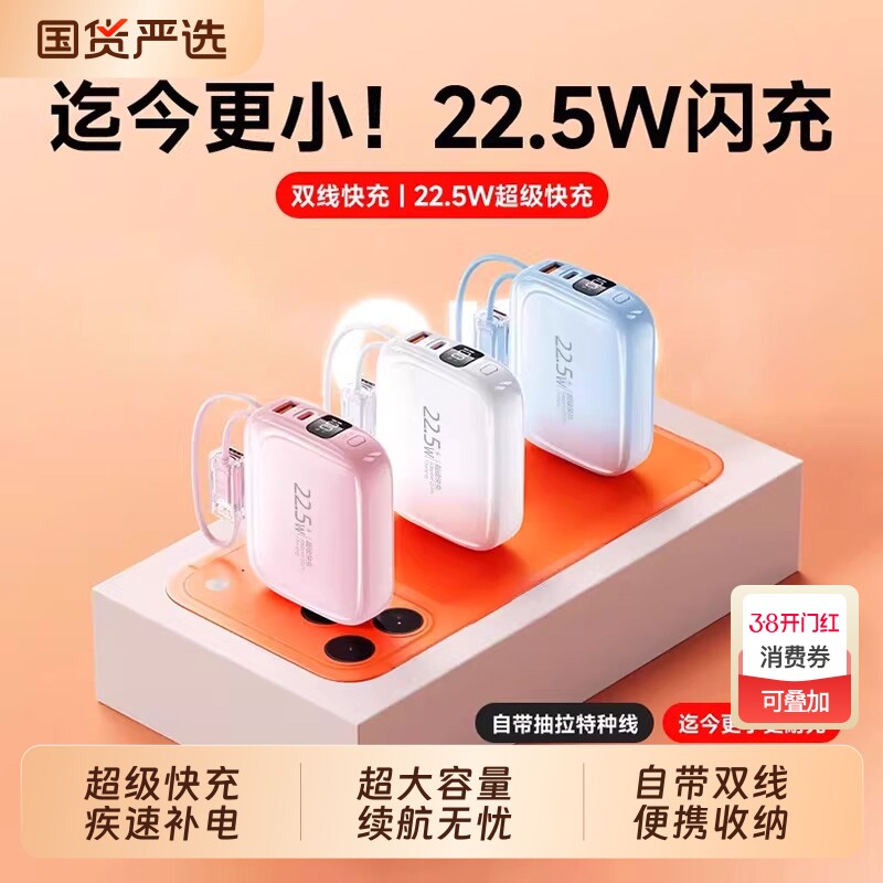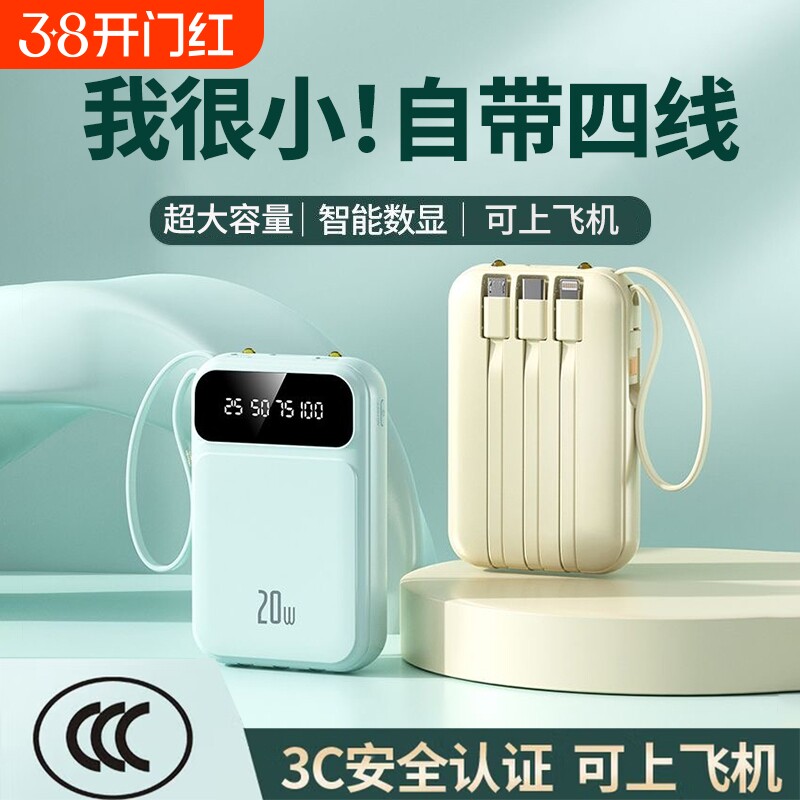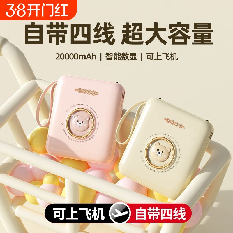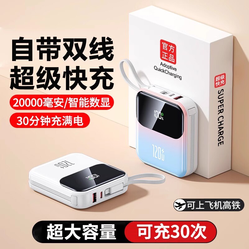 正品自带线充电宝超薄小巧便携迷你快充50000毫安超大容量2万移动电源可爱适用华为oppo苹果vivo手机专用