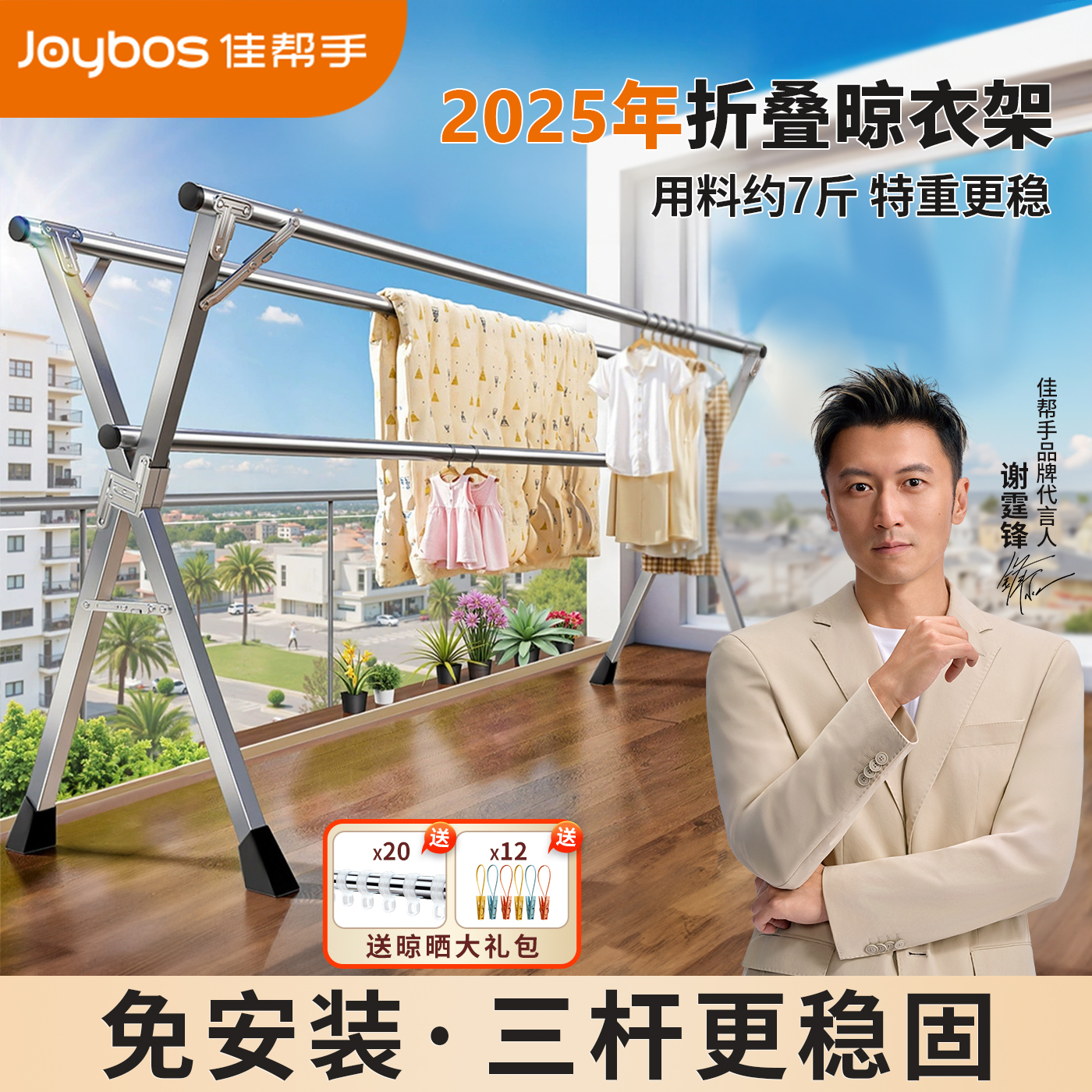 佳帮手用料7斤三杆特重晾衣架落地阳台凉伸缩不锈钢晒被子折叠架