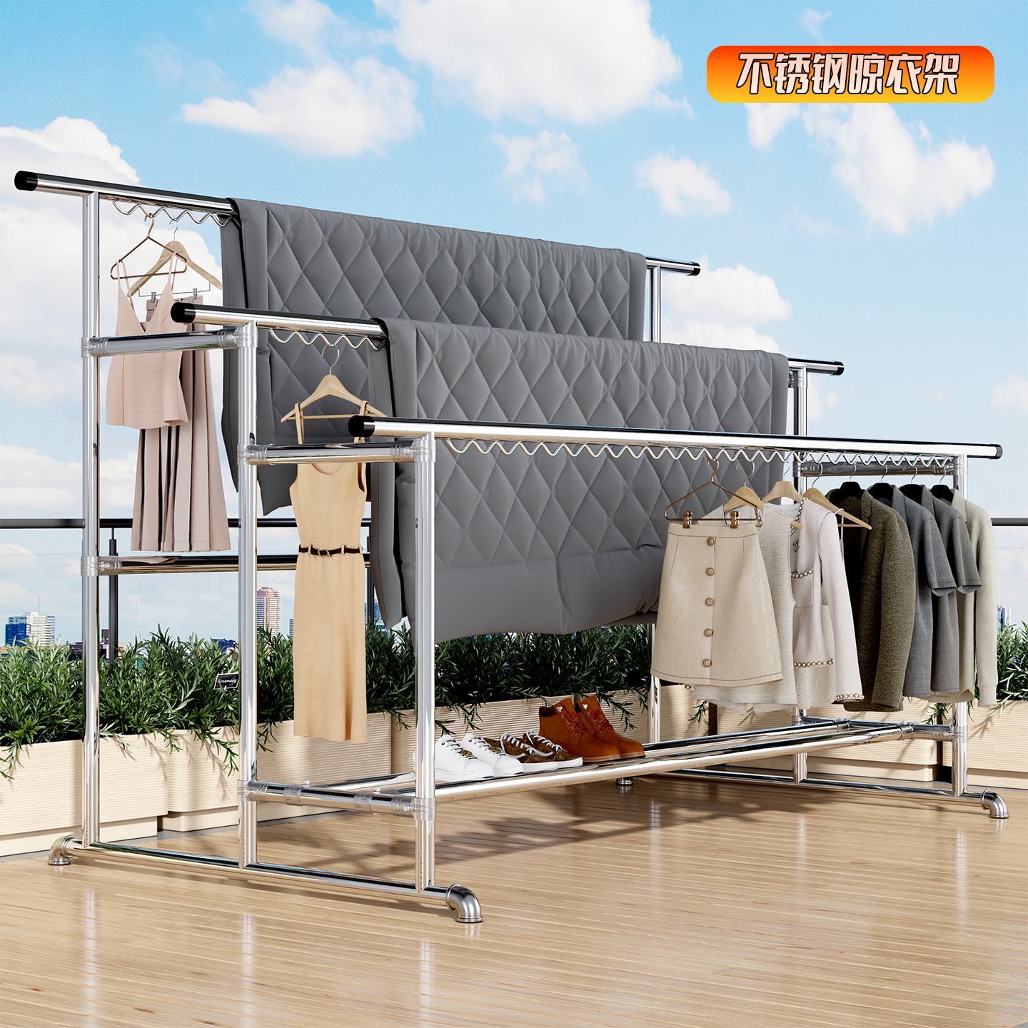 304202不锈钢三杆晾衣架室外落地防风防锈晒被子户外大型晒衣架