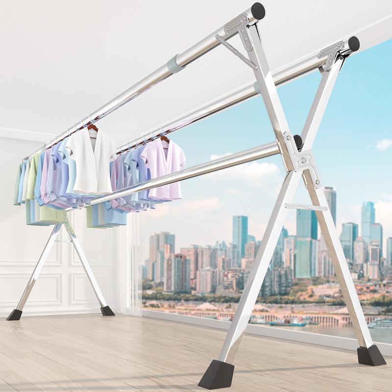 304不锈钢三杆晾衣架落地加厚加粗折叠伸缩阳台房间可移动挂衣帽