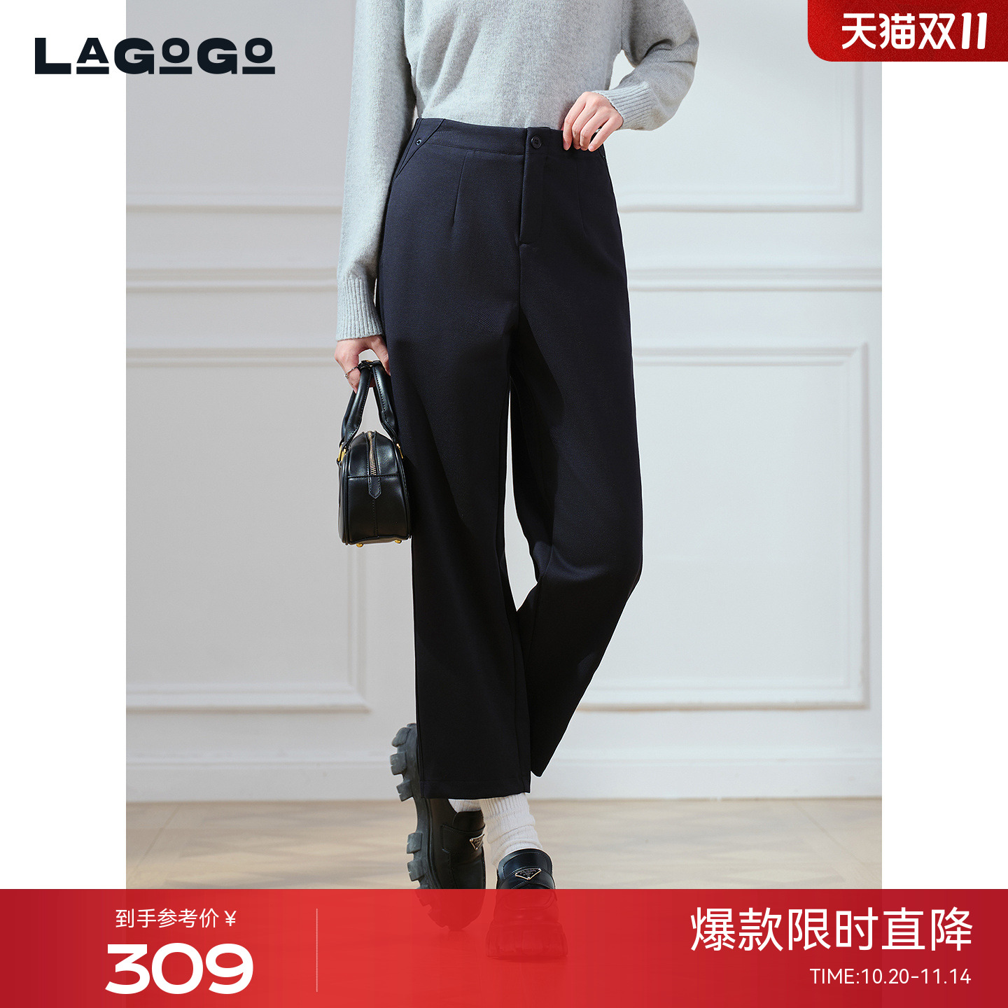 LAGOGO藏青色高腰直筒裤女拉谷谷2025秋冬新款简约通勤裤OCKK438E