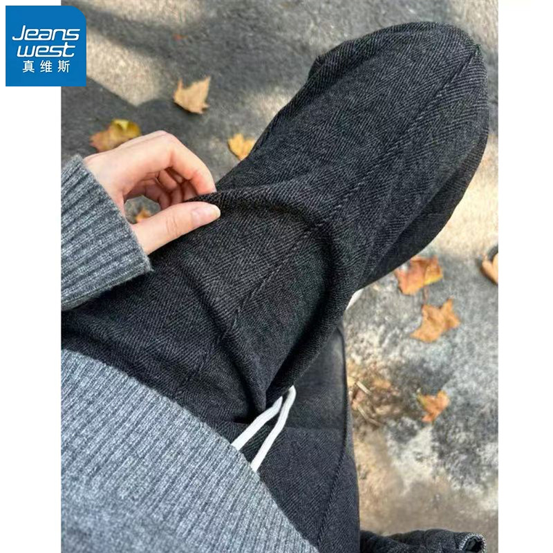 KHV真维斯灰色人字纹加绒毛呢直筒裤女冬2025新款宽松慵懒阔腿裤
