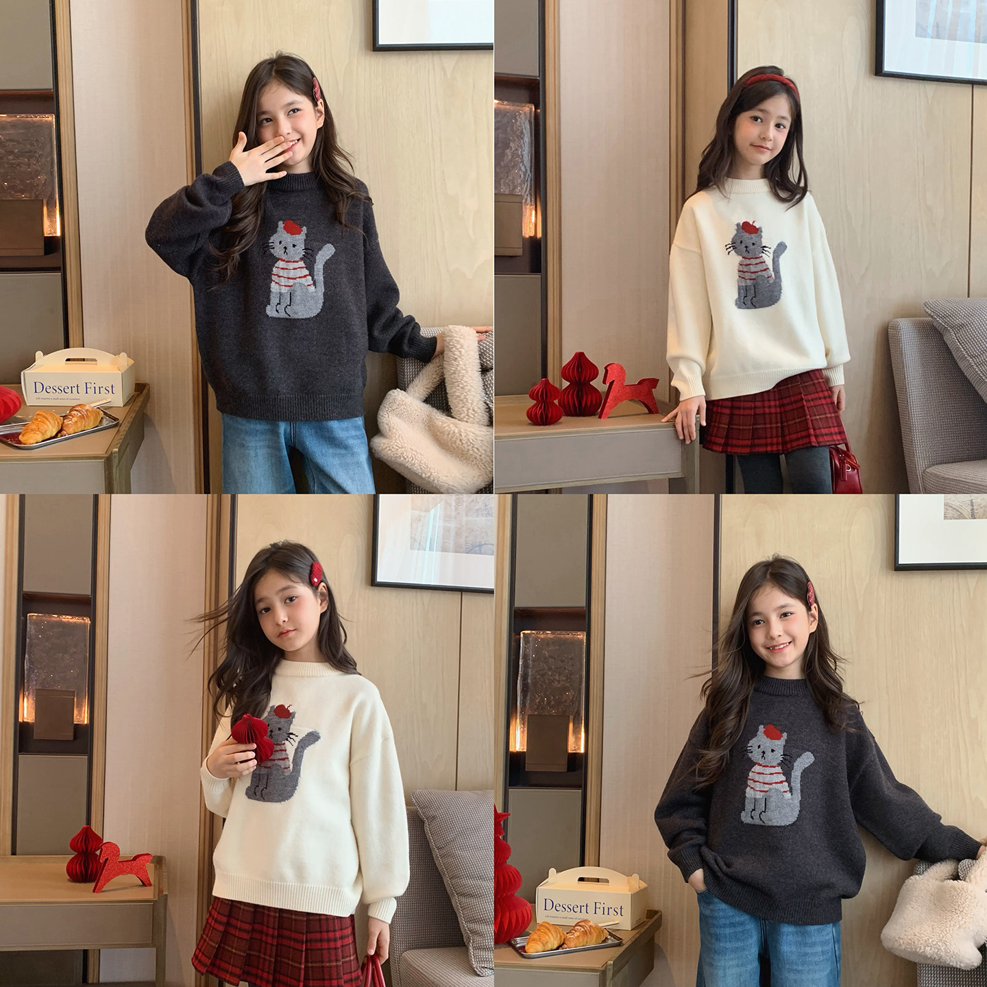 女大童可爱猫咪圆领毛衣2025冬季新款少女慵懒保暖针织衫学生线衫