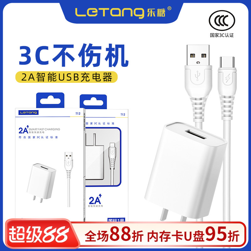 乐糖3C认证国标1号3C认证2A充电头适用于iphone安卓type-c智能手机USB快速充电器闪充数据线套装盒装快充批发