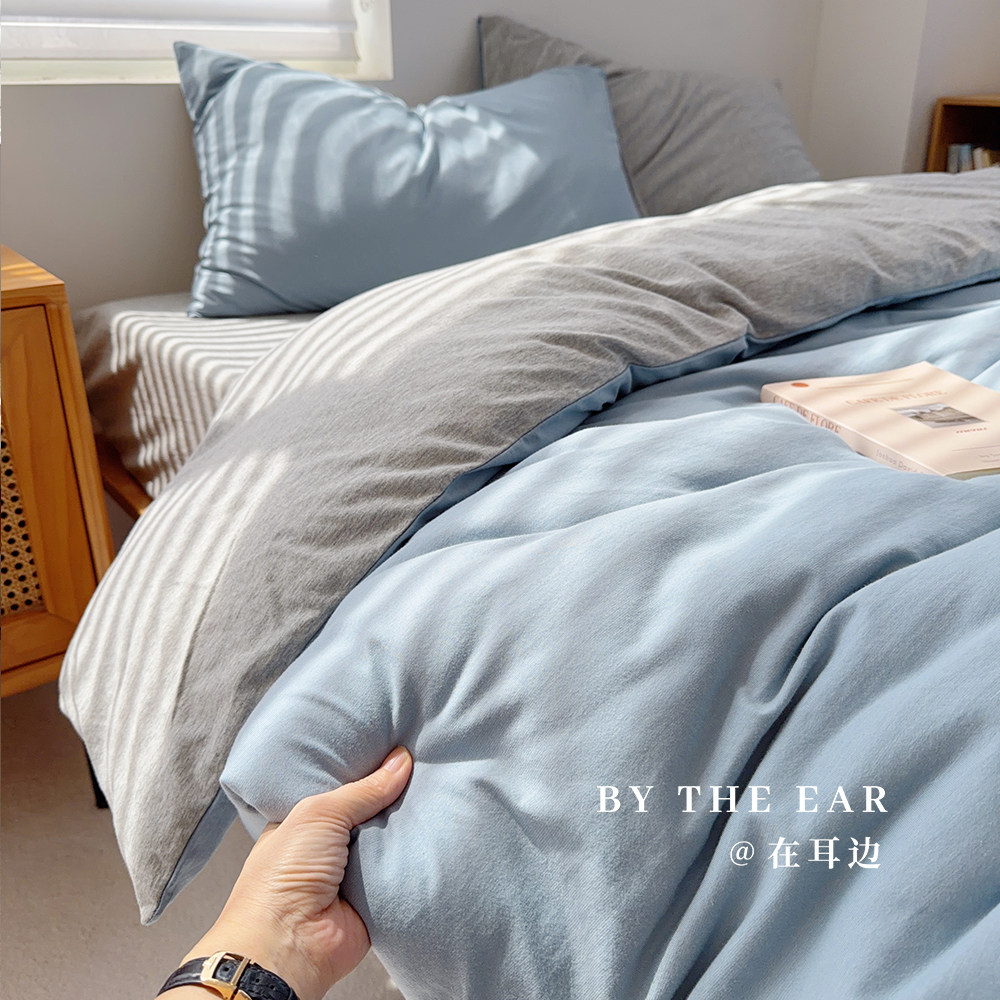 雾蓝撞色|柔软针织棉天竺棉全棉四件套纯色纯棉床单被套床单床品