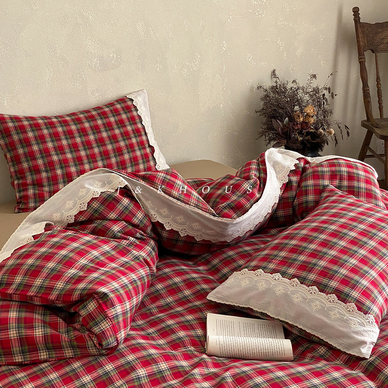 Retro|圣诞复古双层纱全棉四件套新年红格子拼接蕾丝床单被套纯棉