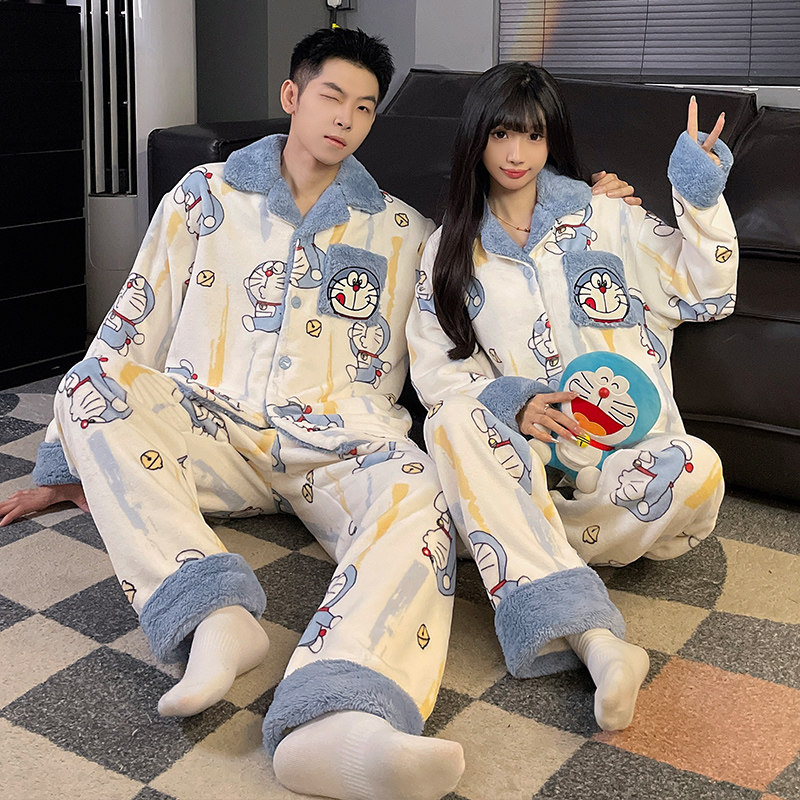 可爱卡通珊瑚绒睡衣情侣装一男一女秋冬季天加绒加厚海岛绒家居服