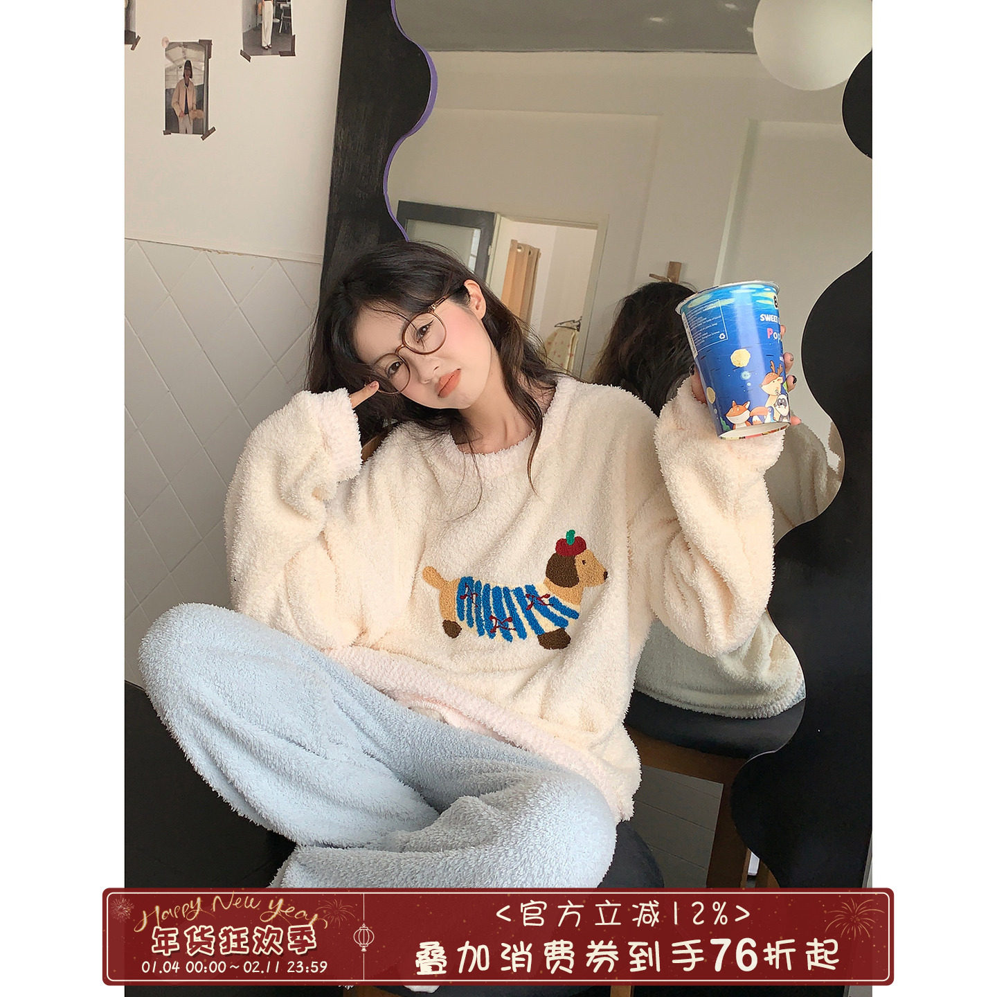 馨帮帮2024年可爱卡通小狗睡衣女秋冬珊瑚绒休闲保暖可外穿家居服