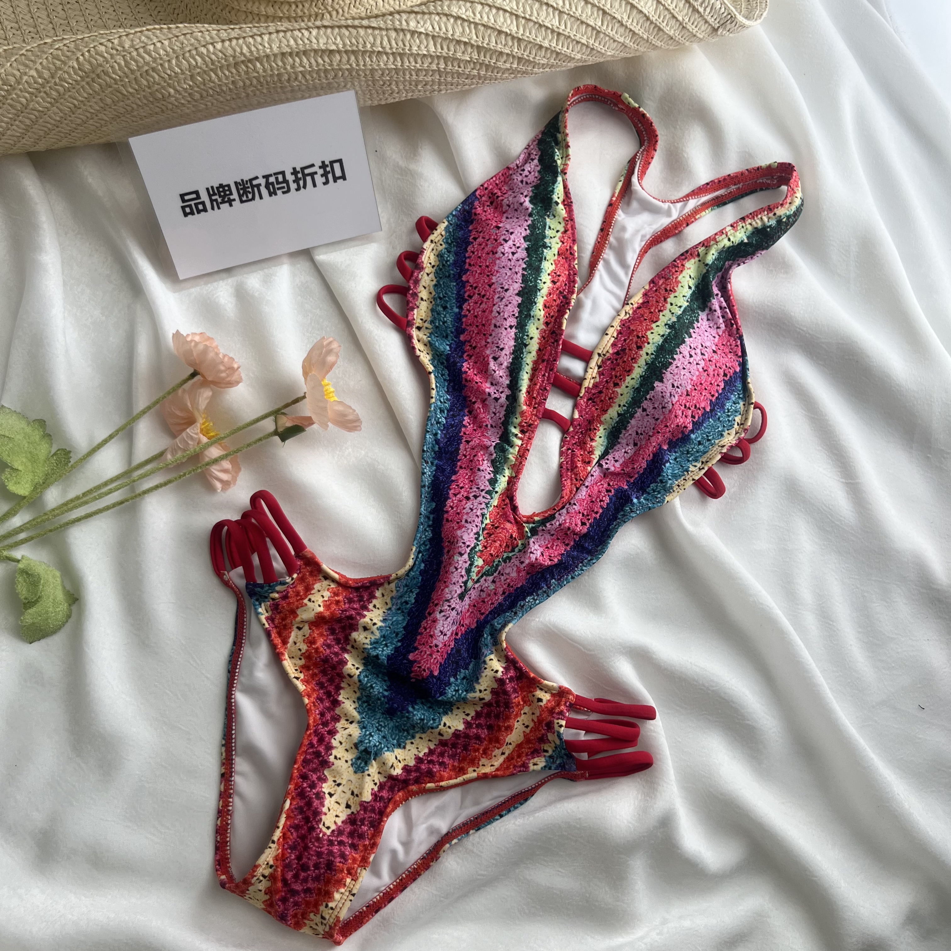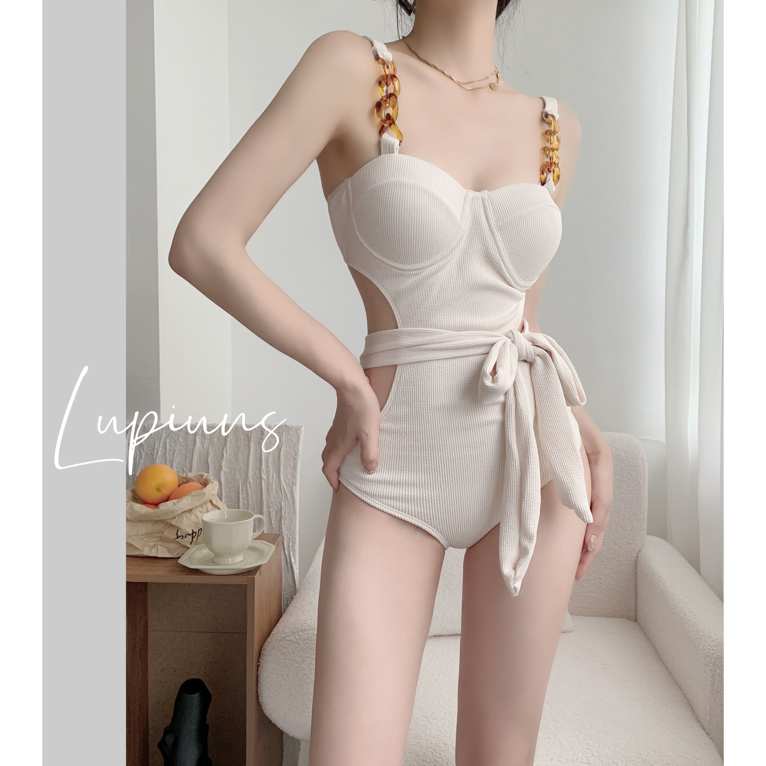 韩国新款纯欲泳衣女性感网红比基尼连体小胸绑带露背镂空温泉泳装