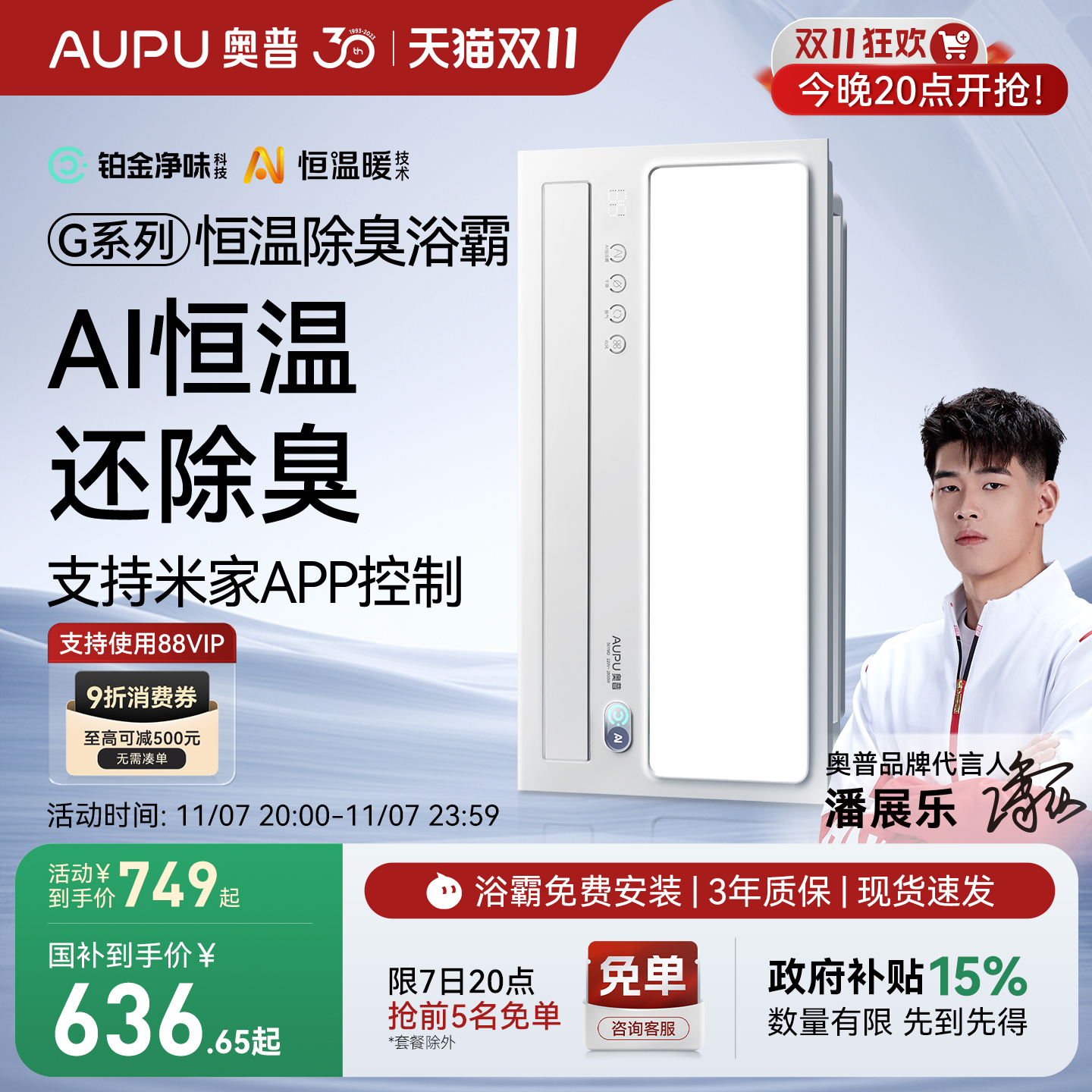政府补贴奥普风暖浴霸智能AI恒温除臭卫生间照明排气扇一体S01MD