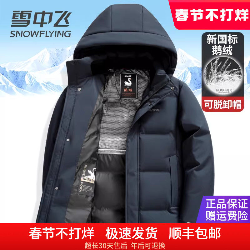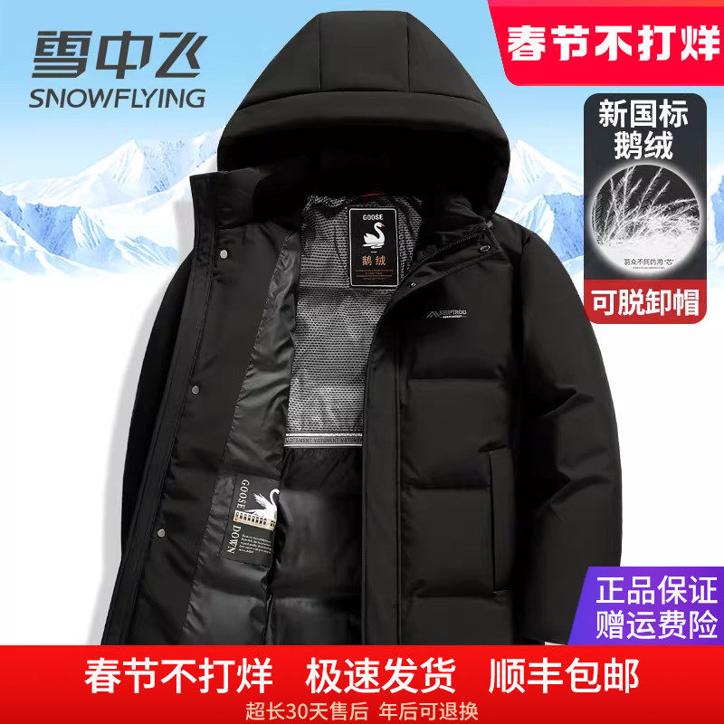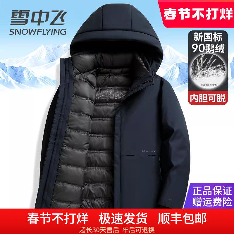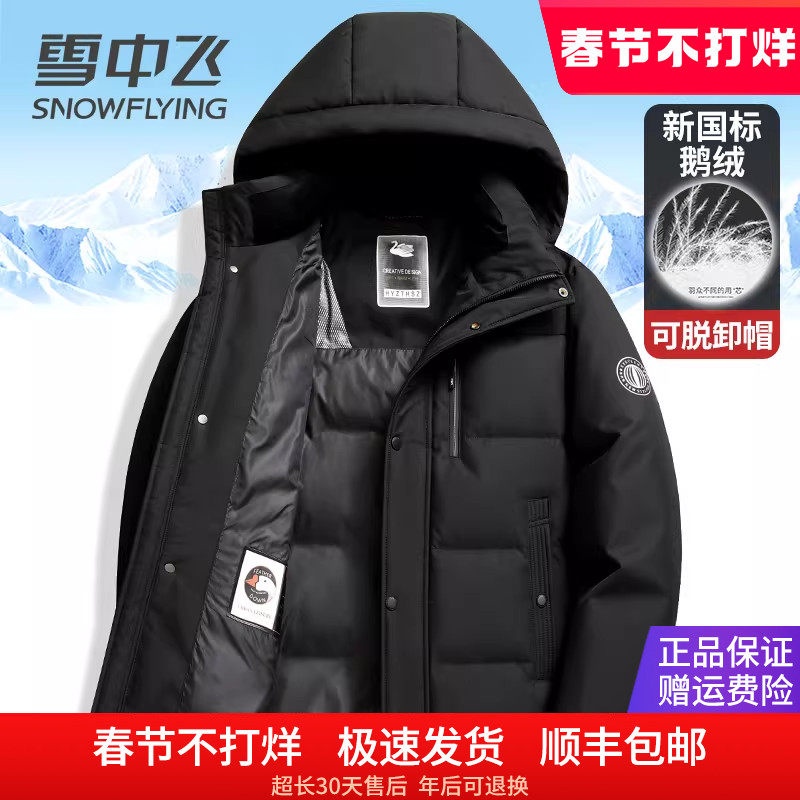 雪中飞男士羽绒服中长款2025冬季新款加厚保暖连帽可脱卸鹅绒外套