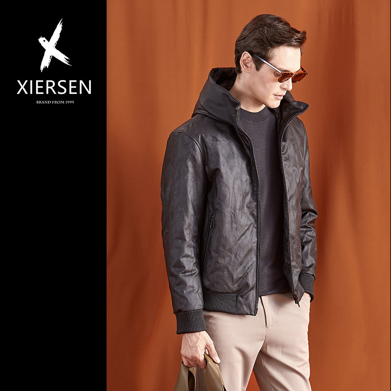 欧洲站轻奢绵羊毛苎麻连帽短款鹅绒羽绒服男加厚时尚休闲修身外套