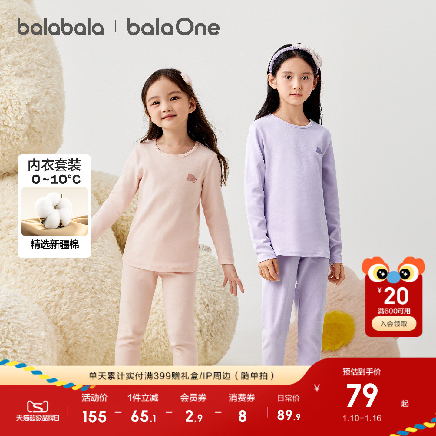 巴拉巴拉女童保暖内衣套装秋冬加厚儿童秋衣秋裤打底睡衣柔软舒适