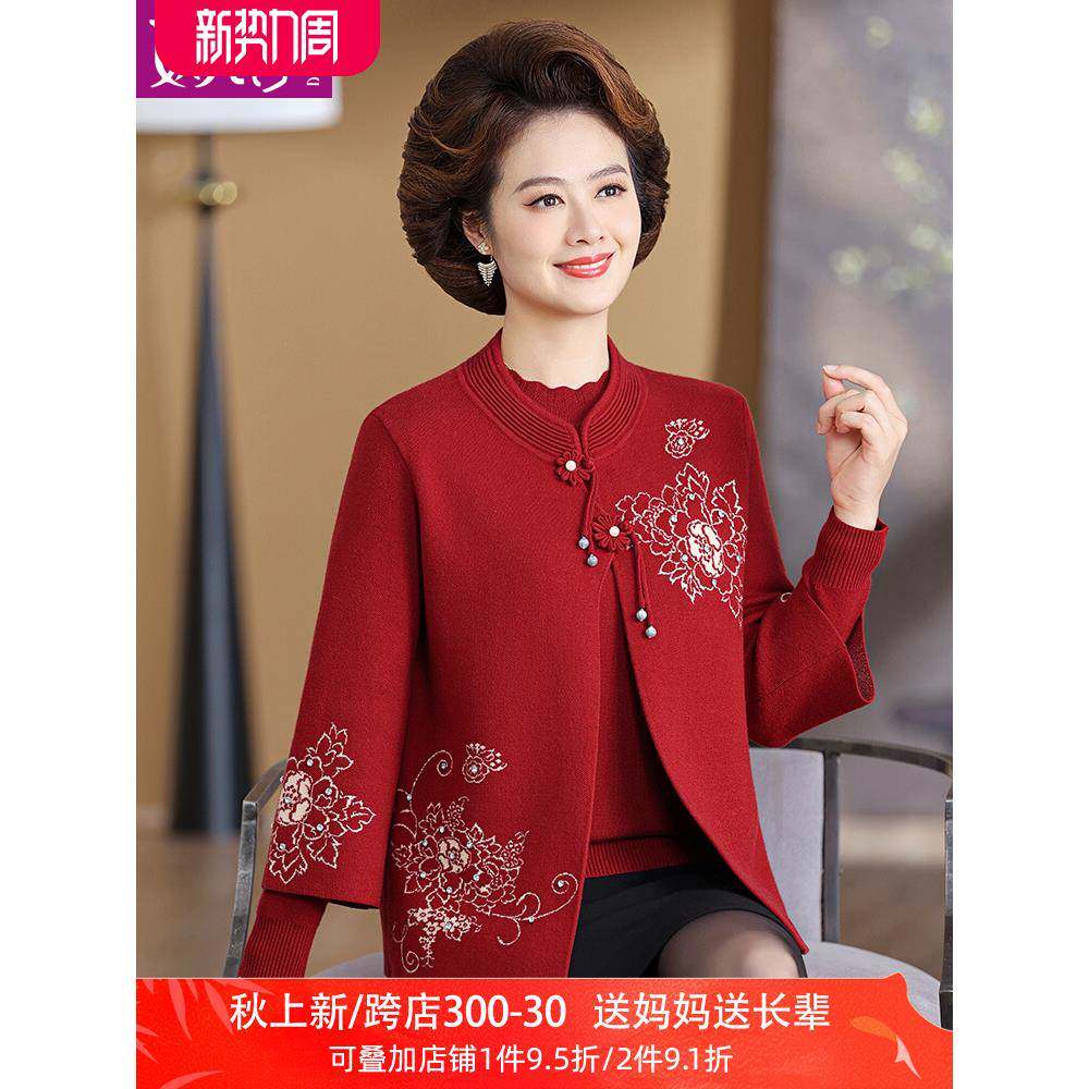 妈妈秋装喜庆两件套上衣女中式针织开衫中老年女婚礼宴会毛衣外套