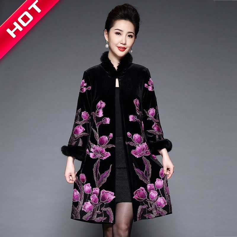高贵大码婚礼妈妈秋冬加绒外套中长款宽松中老年人女装金丝绒风衣