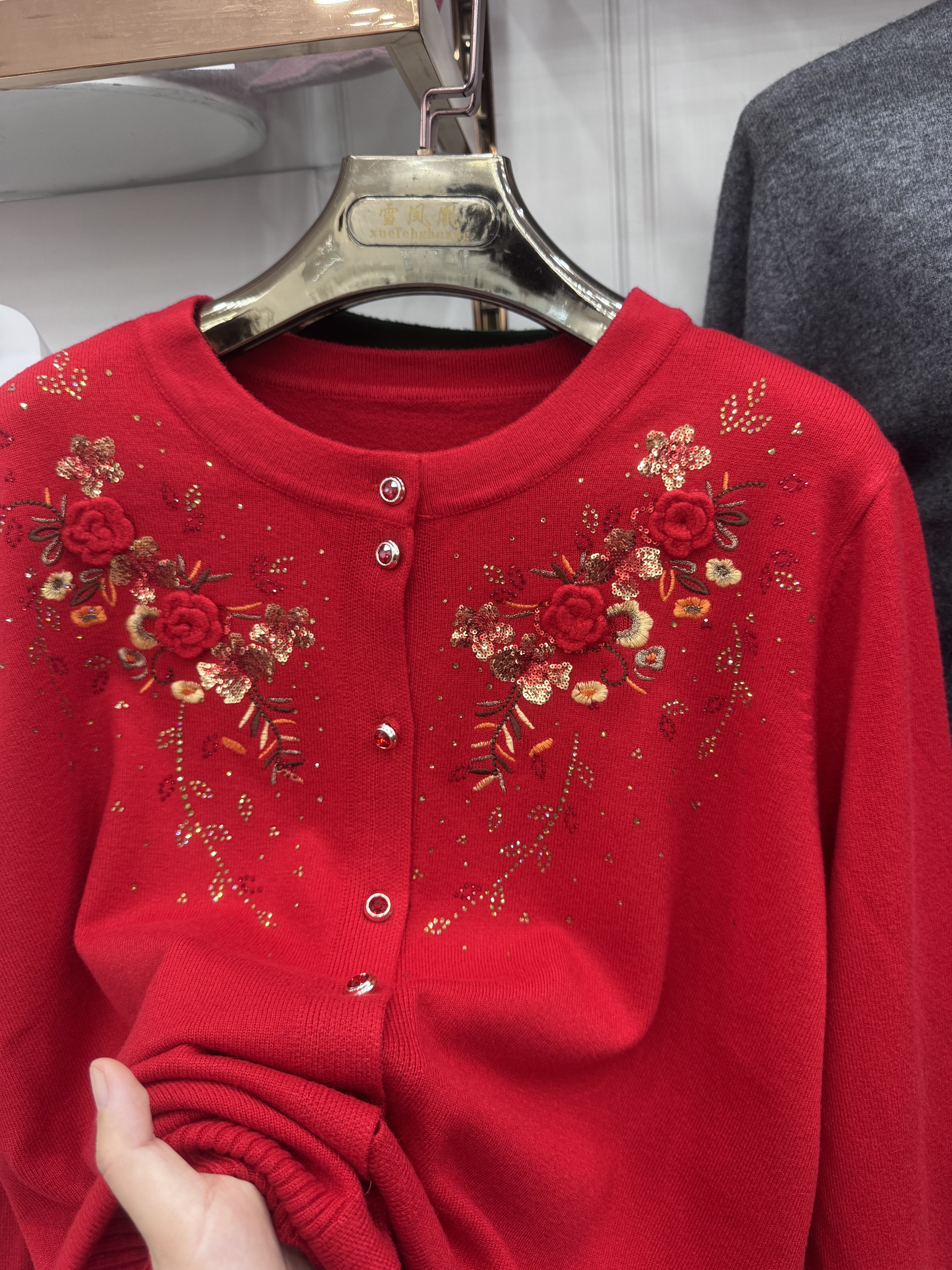 爱美丽妈妈中老年绣花婚礼针织开衫女宽松妈妈本命年红色毛衣外套
