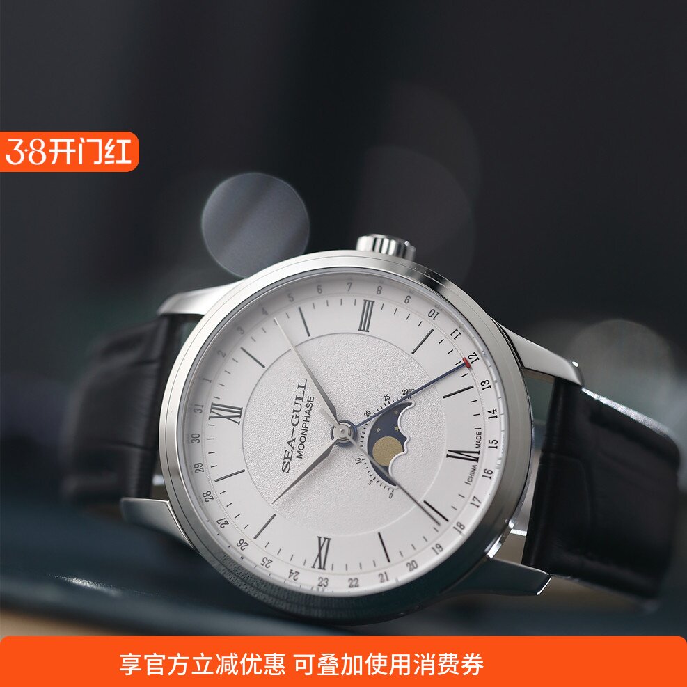 海鸥表月相显示指针式日历多功能自动机械防水男表3006送月相礼盒