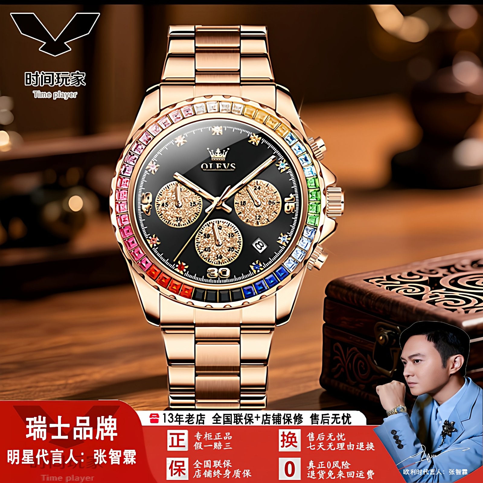 瑞士欧利时品牌新款时尚彩虹圈石英表热销多功能男士手表防水男表