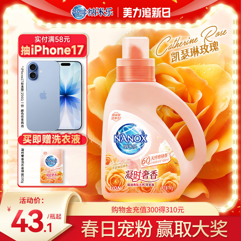 狮王纳米乐凝时奢香精油香氛天然洗衣液持久香氛柔顺凯瑟琳玫瑰香
