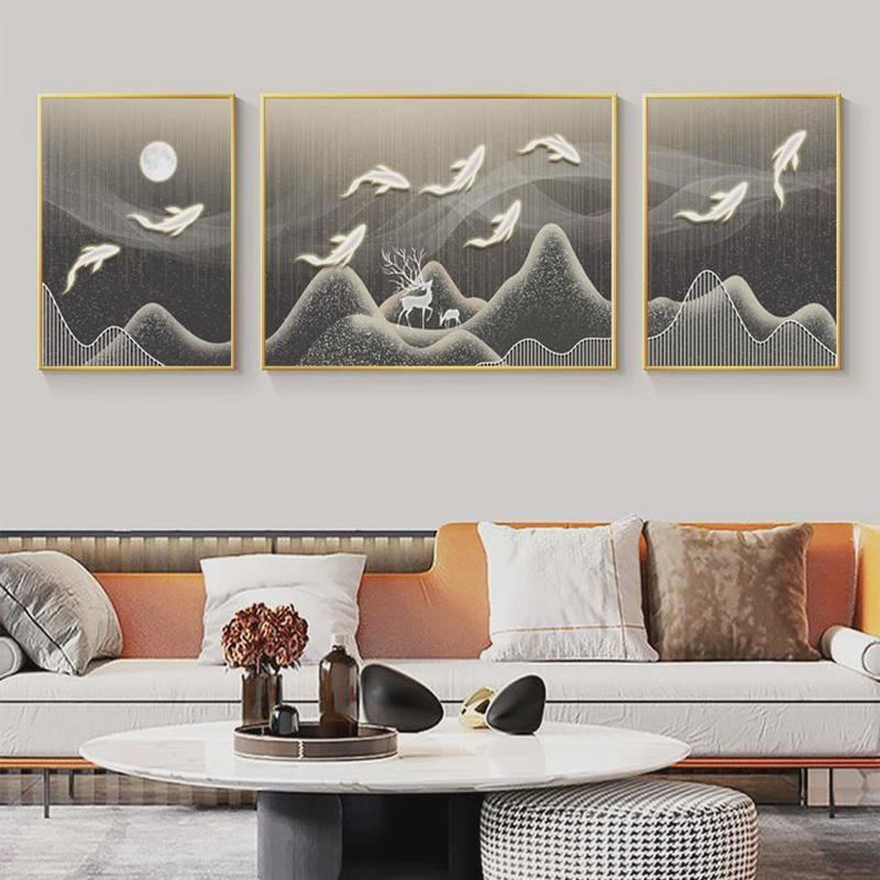 客厅装饰画摆件背有靠山麋鹿抽象沙发背景墙挂画高档发财树三联画