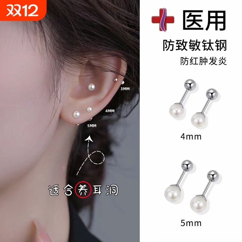 【珍珠钛钢耳钉养耳洞防过敏】爆款睡觉免摘螺丝拧扣一饰两戴耳钉
