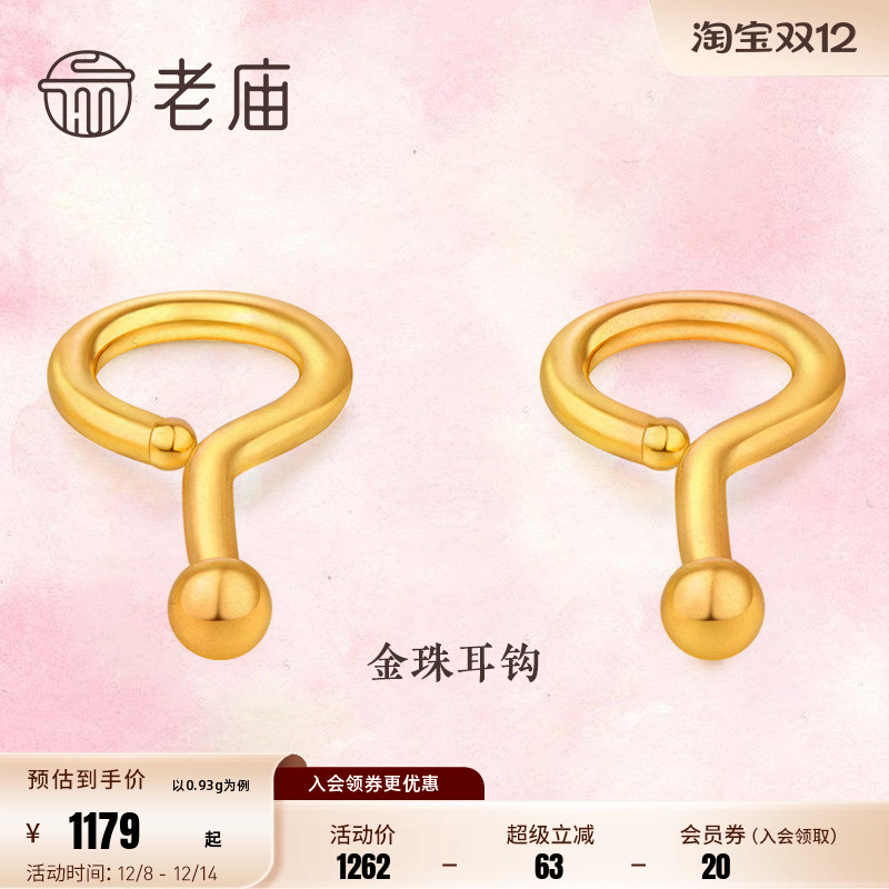 老庙黄金官方足金999养耳棒耳钉女金珠耳钩弯钩简约耳钉送礼物
