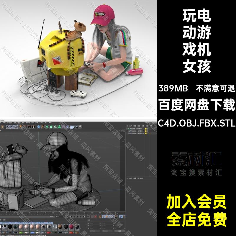 C4D FBX STL OBJ玩电动游戏机女孩人物卡通电视机插座手柄3D模型