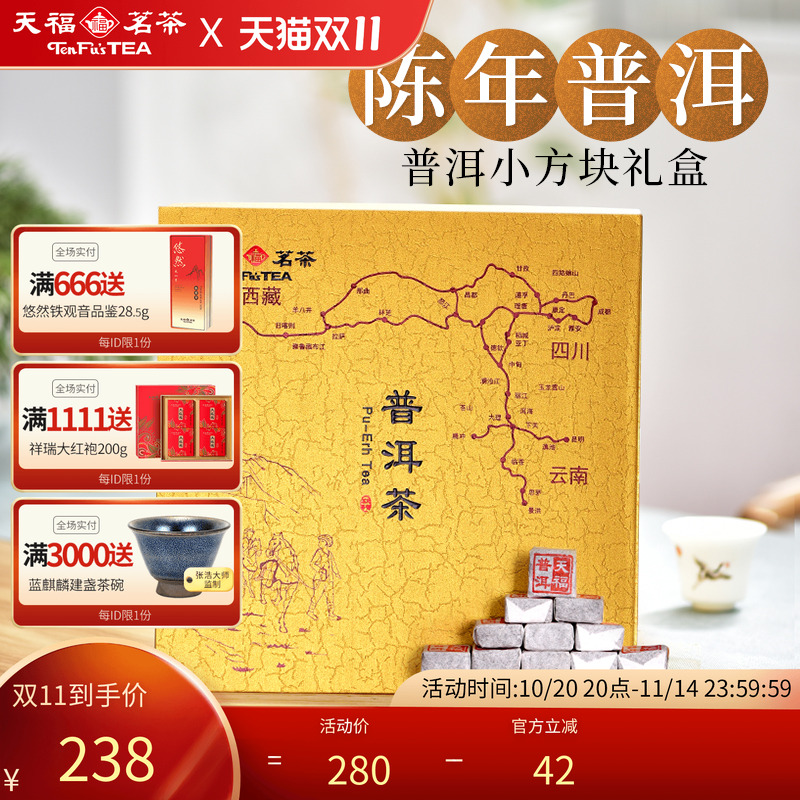 天福茗茶 小方块普洱熟茶紧压茶砖 云南普洱小沱茶小砖茶礼盒384g