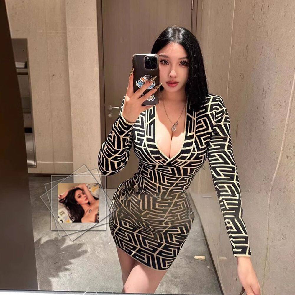 【当日发】御姐气质高级感提花亮丝低胸长袖修身包臀绷带连衣裙女
