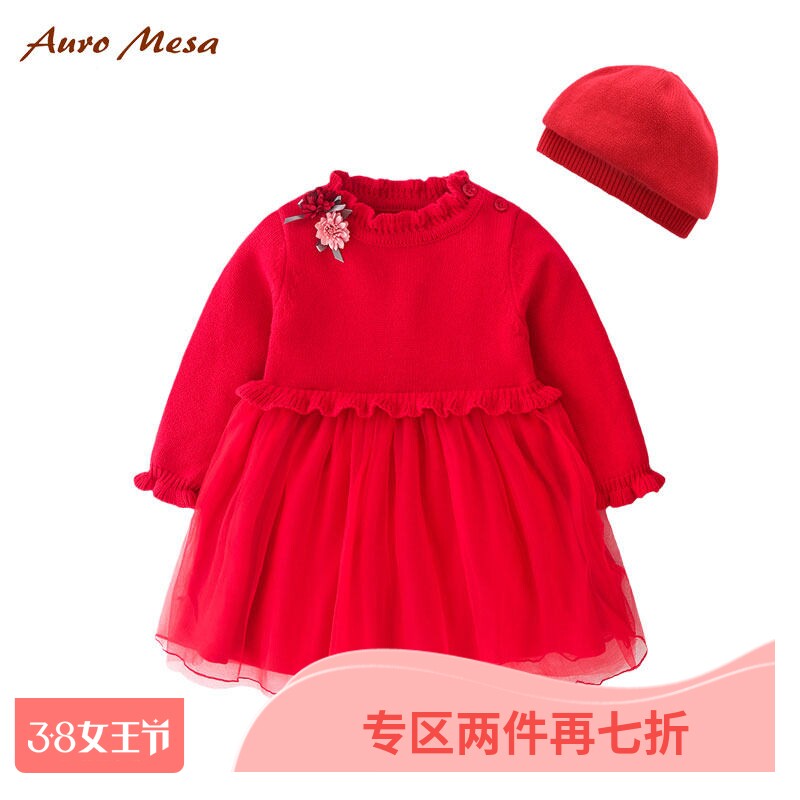 AuroMesa婴儿秋季新款大红针织网纱连衣裙女童长袖花朵拼接公主裙