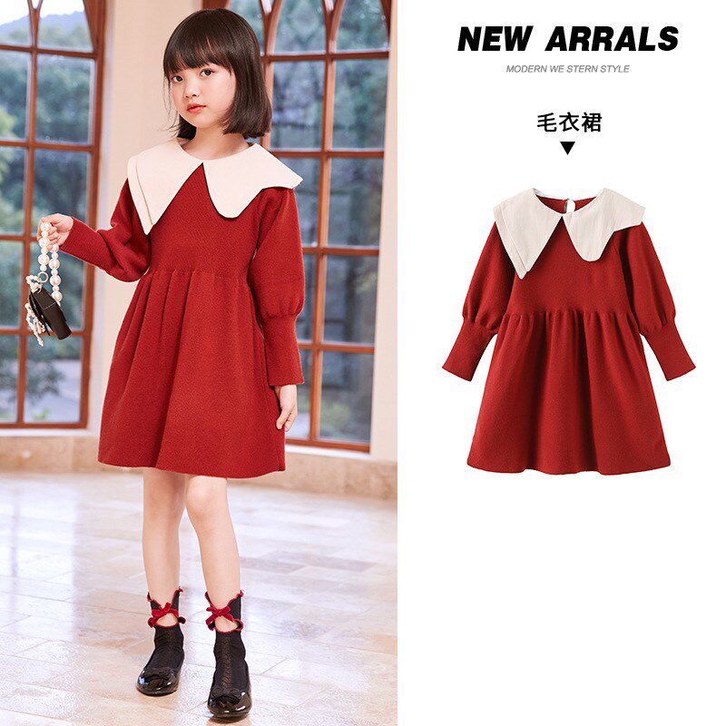 童装毛衣连衣裙2023秋冬新款儿童针织毛衣学院风大红色女童毛衣裙