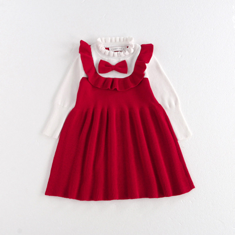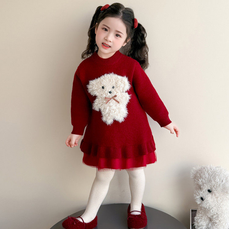 大红色女童连衣裙小女孩纯棉针织毛衣裙儿童拜年服宝宝公主礼服裙