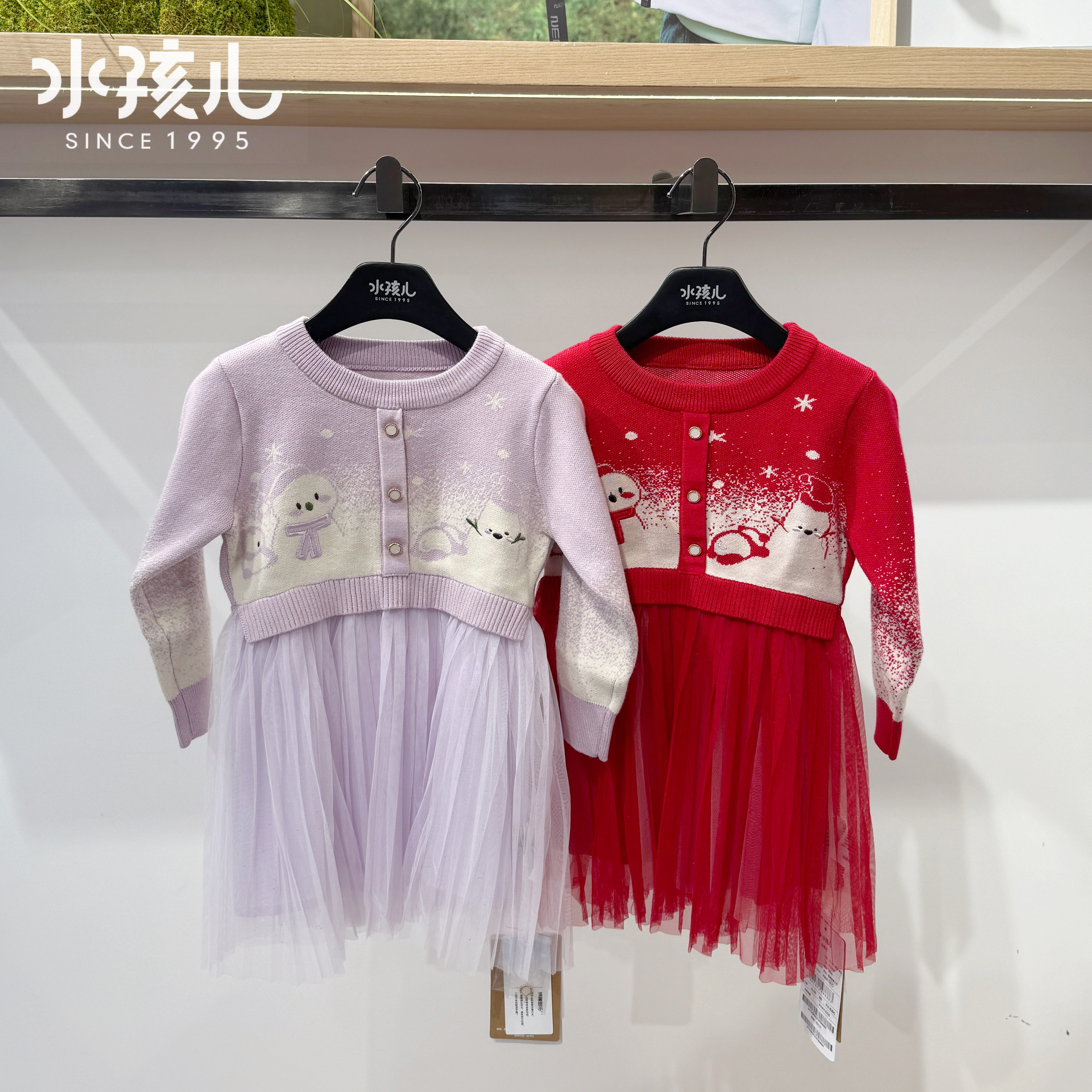 水孩儿童装女童针织拼纱大红色连衣裙正品2025冬季新款时尚公主裙