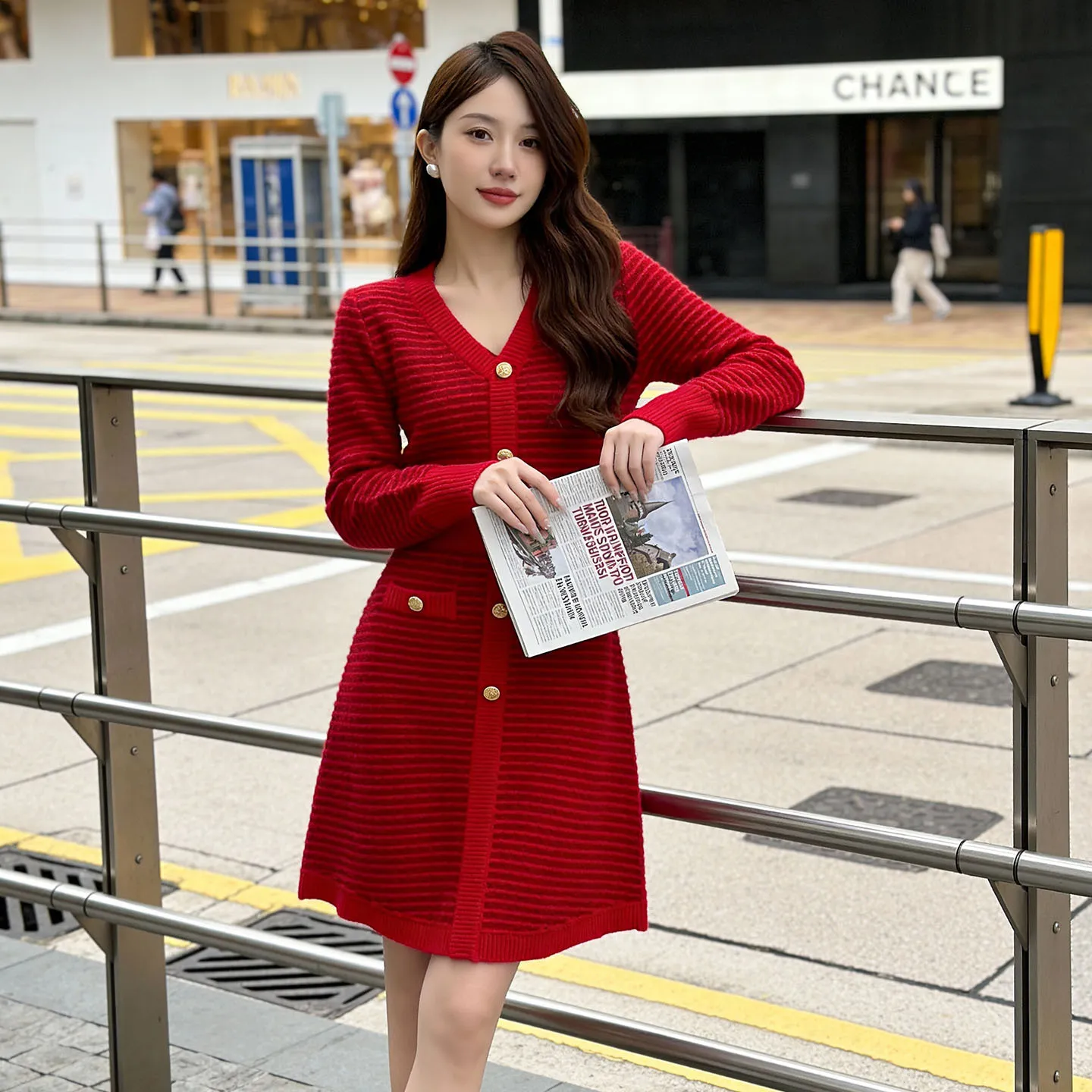 过年喜庆大红色早春小香风V领金属扣气质修身显瘦长袖针织连衣裙