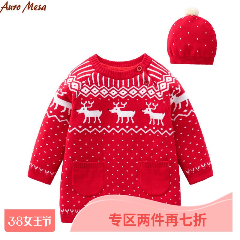 AuroMesa婴儿圣诞服冬季针织裙女宝大红麋鹿加绒连衣裙帽子姐弟装